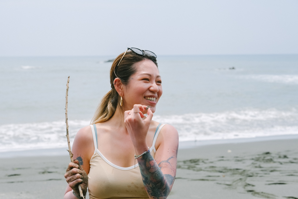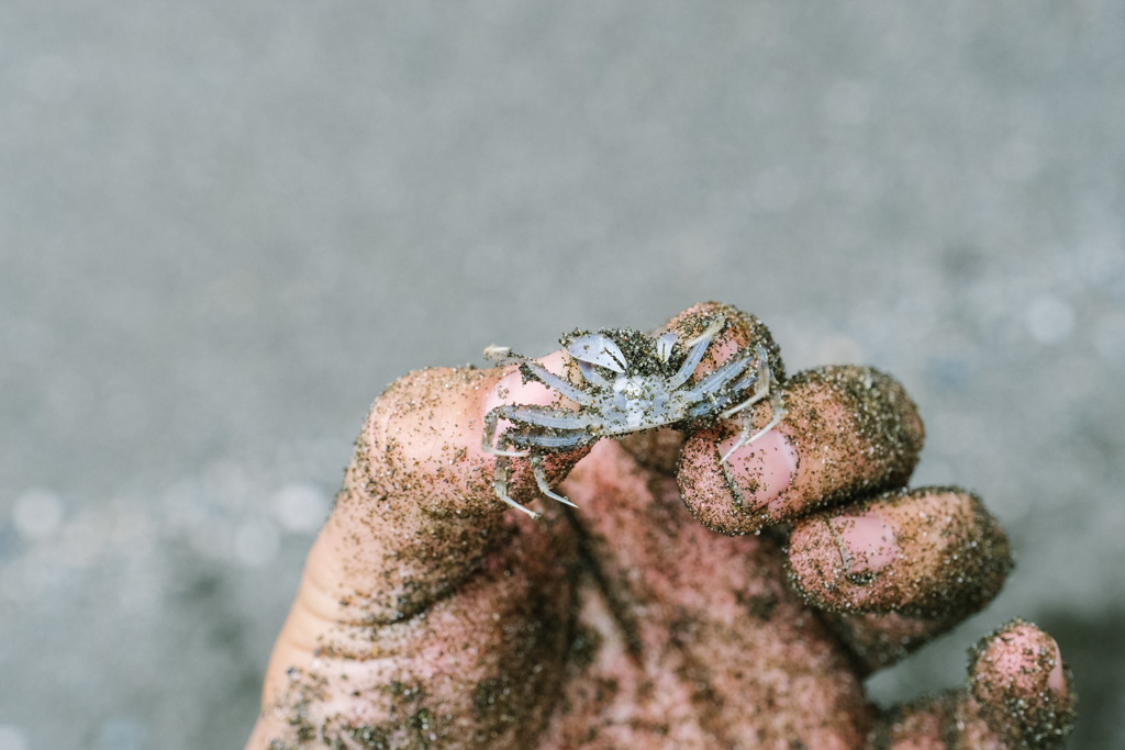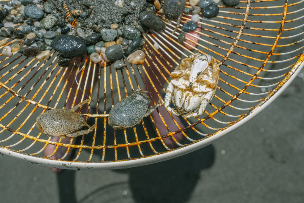 成果驗收,第二次體驗的我no速,但一旁邊偽海女初試身手就五隻。俗稱「倒退噜」的浪花蟹在電風扇殼上四處倒退竄逃看起來狼狽滑稽,但那個腳太像蟑螂我實在不行。放生時,浪花蟹趁海浪湧上鑽進沙著瞬間消失,大家嘖嘖稱奇說根本《神鬼傳奇》裡的聖甲蟲吧!