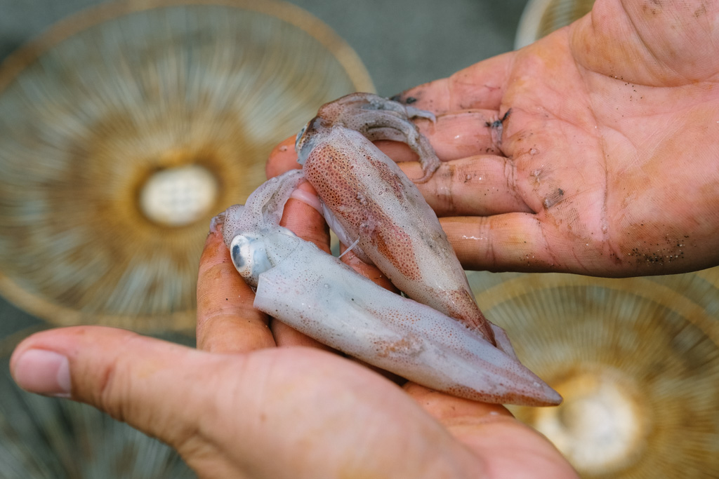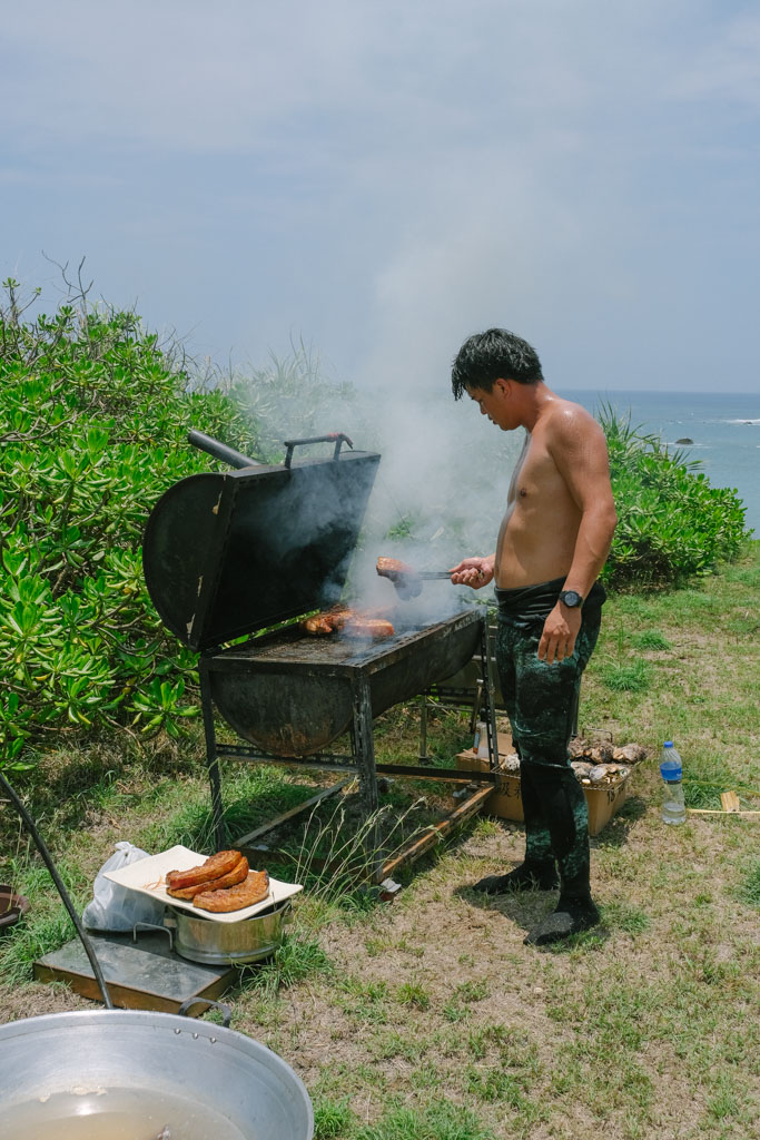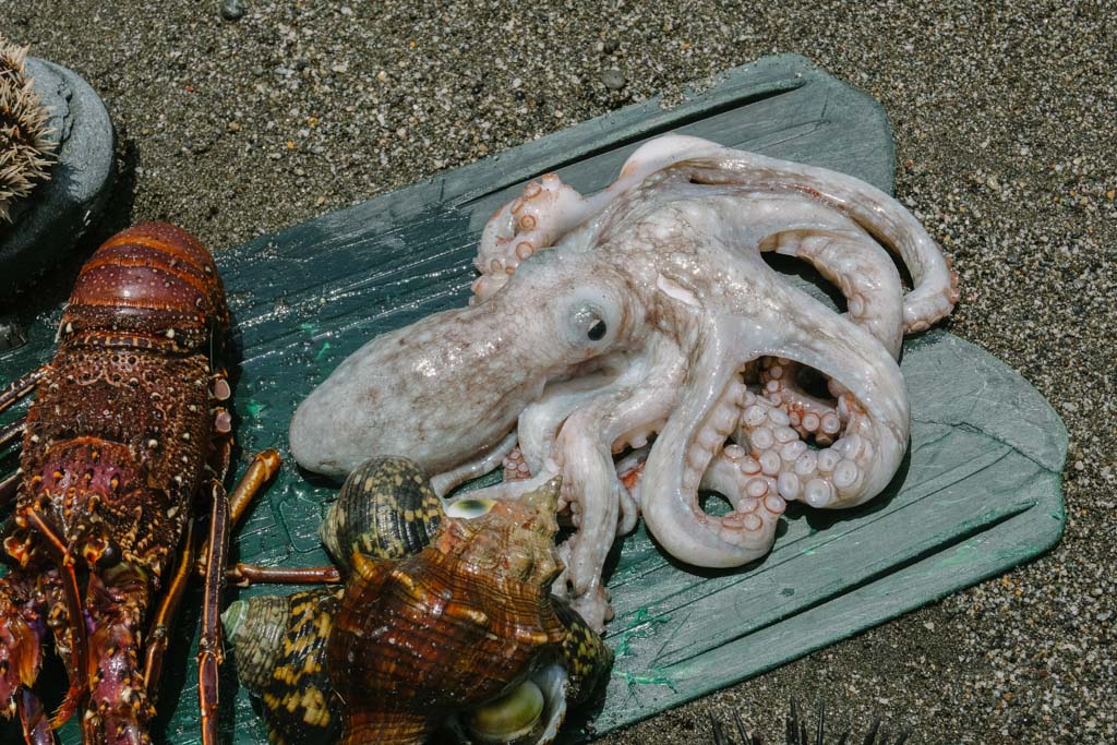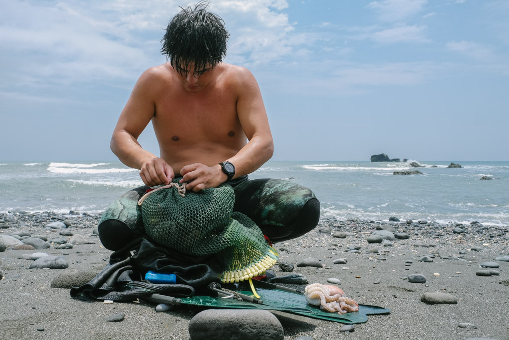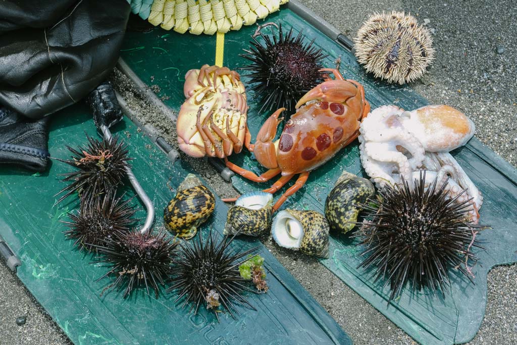 另一邊,最年輕的Saway揹著魚網獨自從海裡走上岸,在眾家記者柔性勸說下脫上半身為大家開箱畫面比較帥。Saway嚷嚷著今日海水渾濁、能見度低收穫不多,然後從網子裡陸續掏出龍蝦、螃蟹、紫海膽、蠑螺、章魚和麵包蟹,對城市鄉巴佬們來說已經超厲害,開心等會上岸可以加菜。