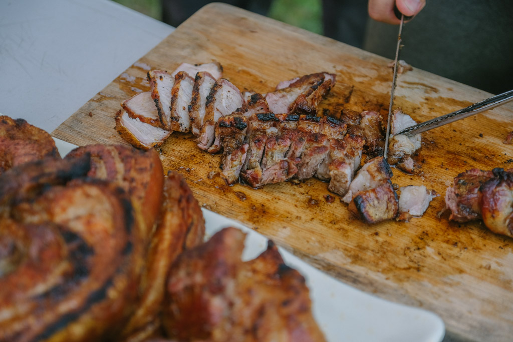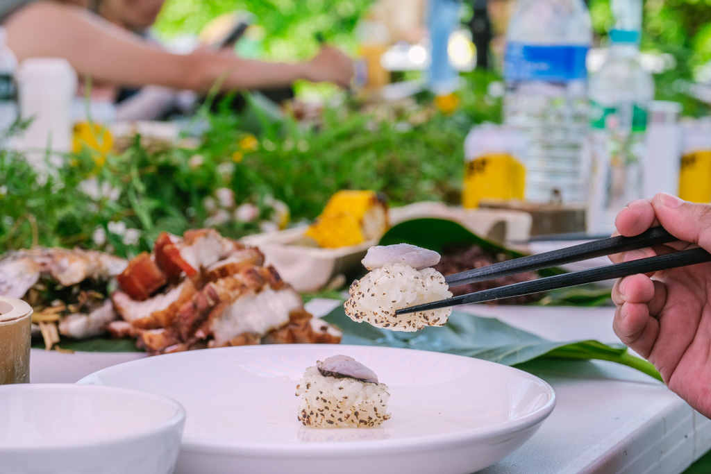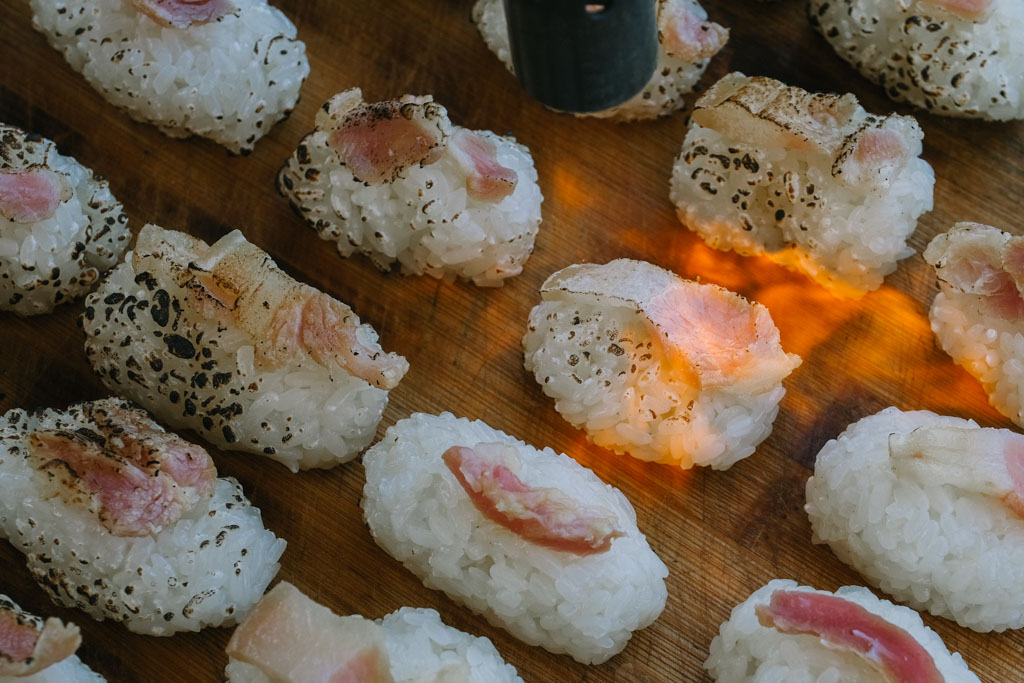 車輪茄、糯米椒和好甜的玉米都是在地農民栽種,還有涼拌海菜和胡麻醬山蘇。魚肚裡塞滿刺蔥、蒜頭和其他香料的烤台灣鯛大家讚不絕口,我也第一次吃到肉質有嚼勁的飛魚生魚片成就(?)解鎖。鋪放在長濱糯米飯上直火炙燒又是另一番風味,下一道炙燒豬肉握壽司的鹹香我也好喜歡。