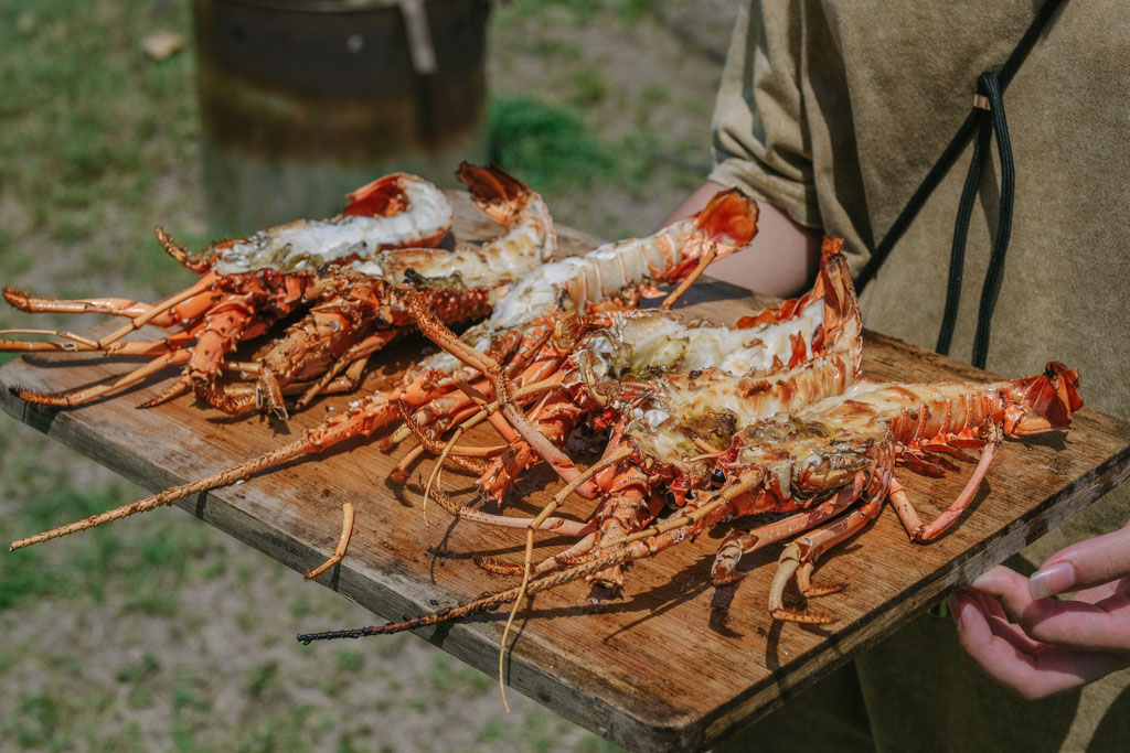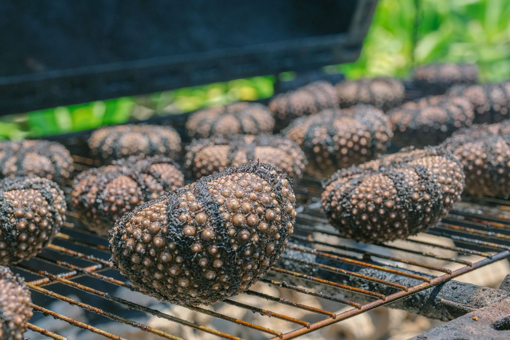 帳蓬外,烤爐上輪番上陣的還有成堆紫海膽,模樣根本草間彌生南瓜的暗黑版。壓軸最後是一隻隻龍蝦,都是這兩天新鮮海底撈真的有夠奢侈。