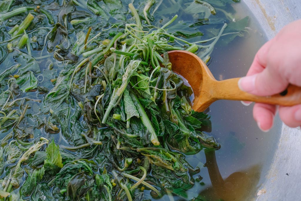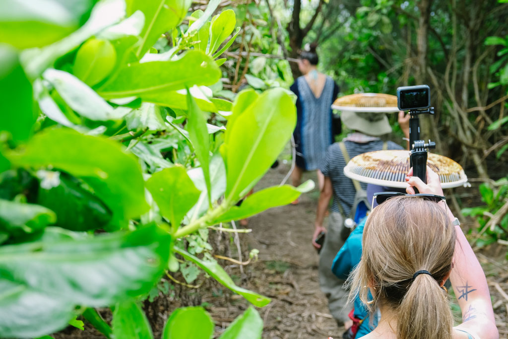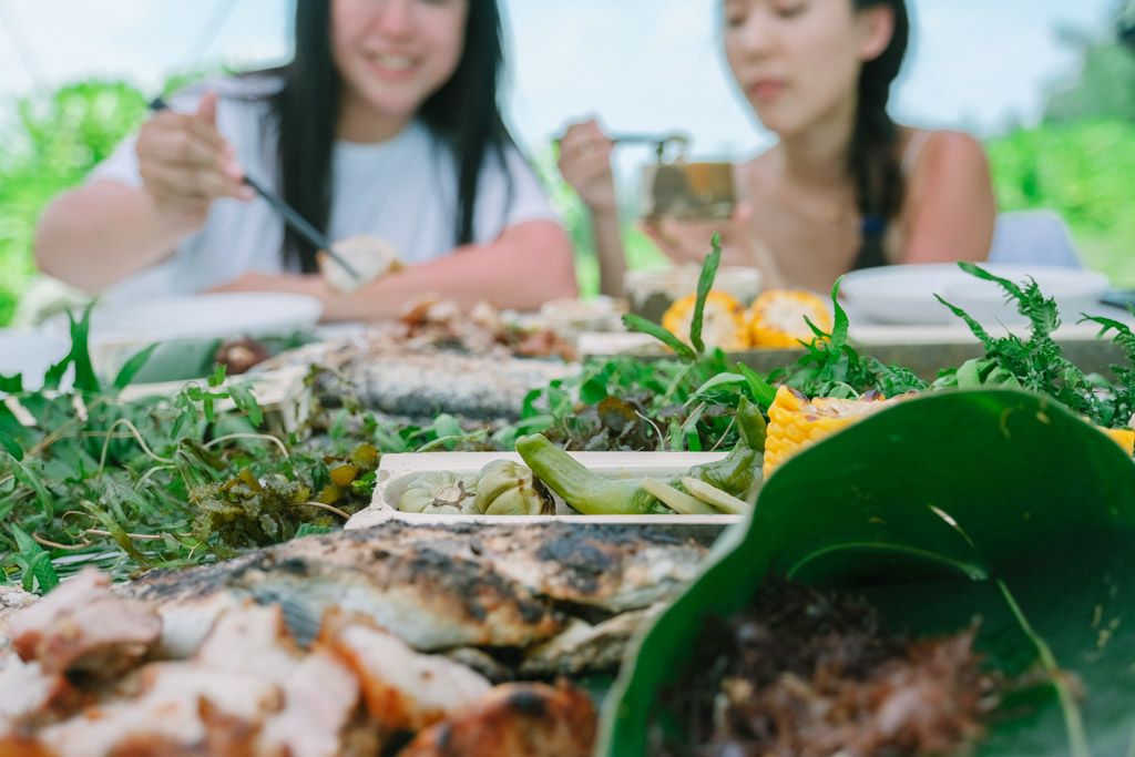 回到崖邊草地上,小嚴和其他工作人員已張羅好澎湃的山海宴,教我們先將成串的月桃花出汁來洗手。