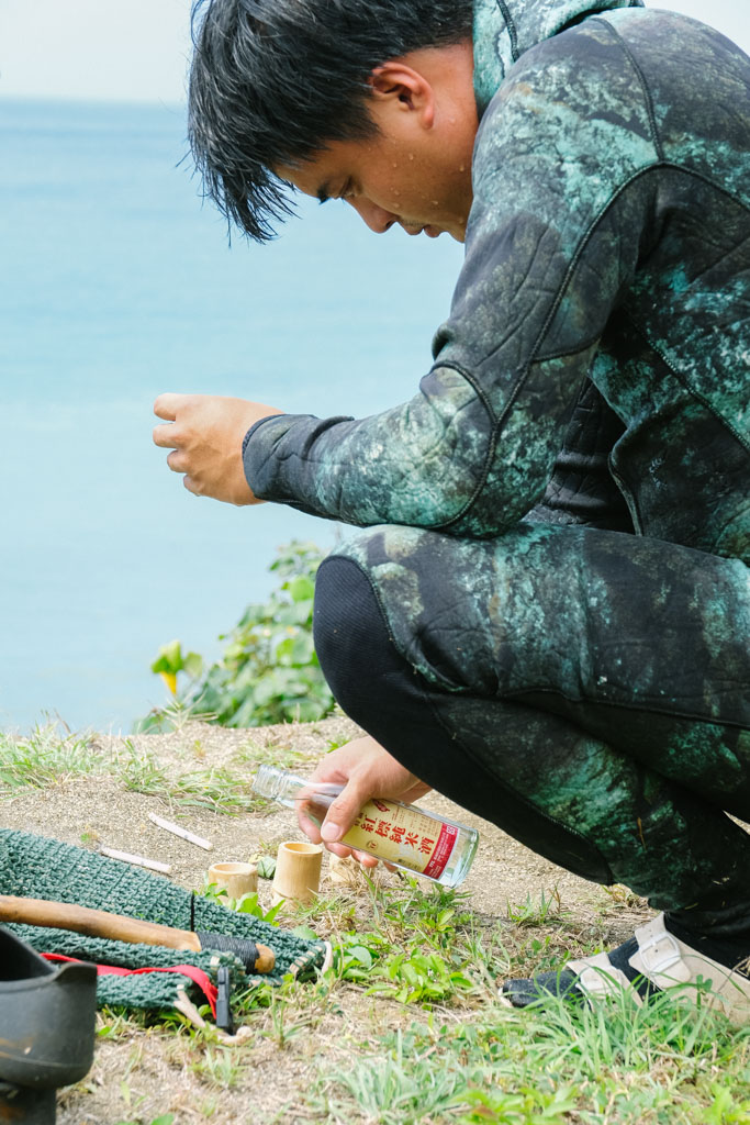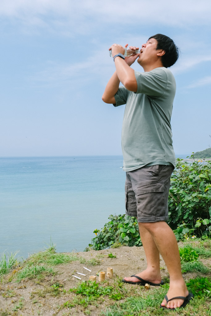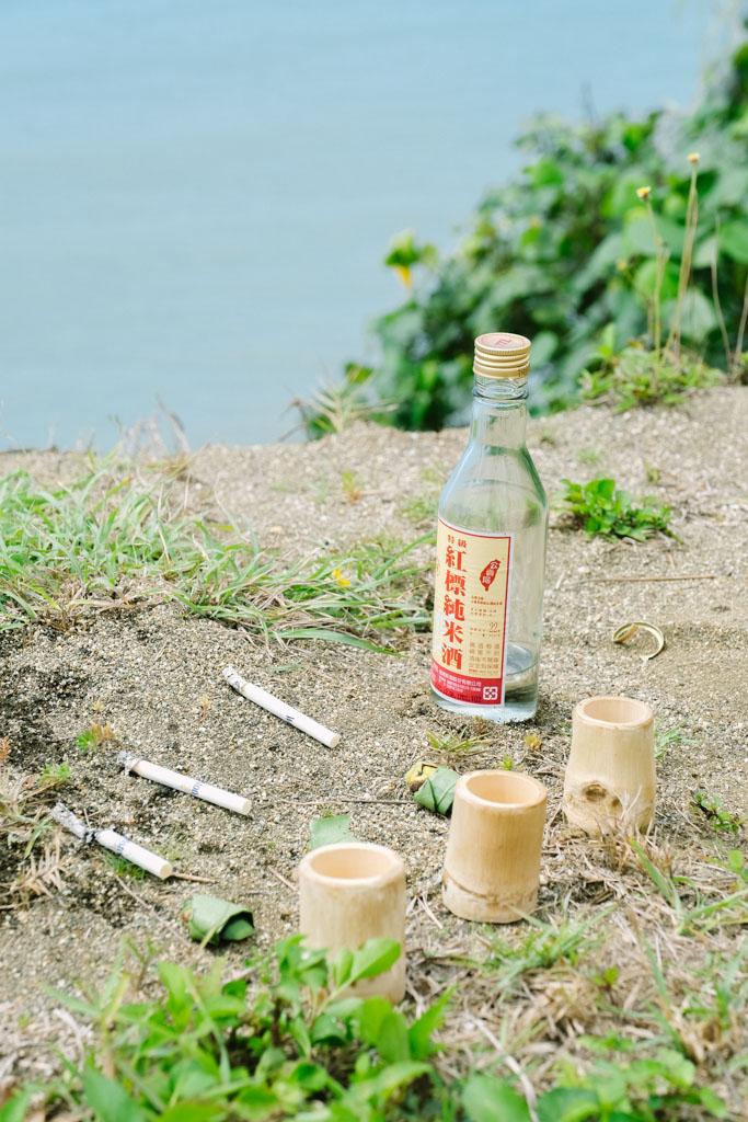 在我們走下沙灘捕浪花蟹之前,三個男人先領頭進行傳統儀式,地上擺放三支香菸、三顆檳榔和三杯米酒,敬告神靈我們到來,每個人再輪番啜飲一口,祈求豐收與平安。