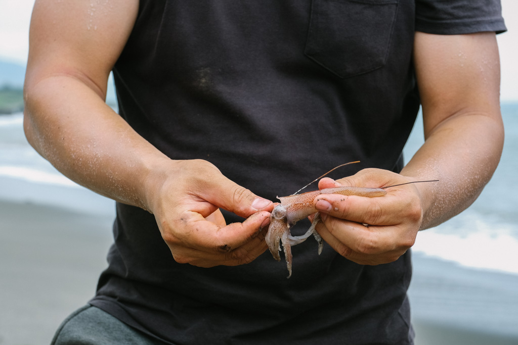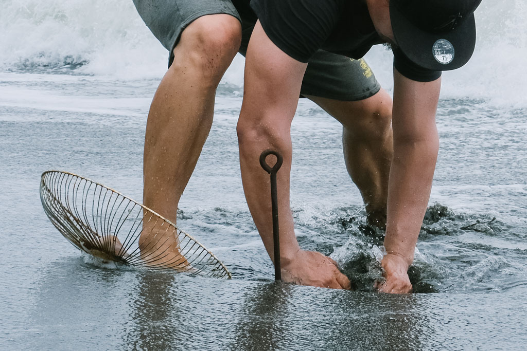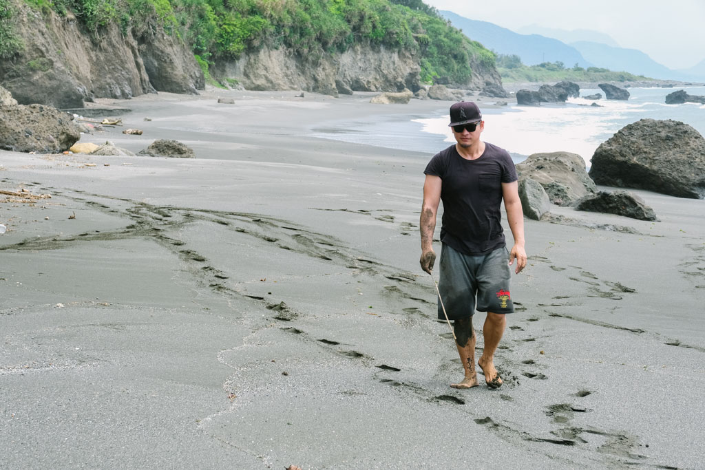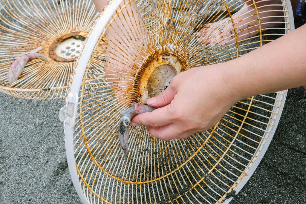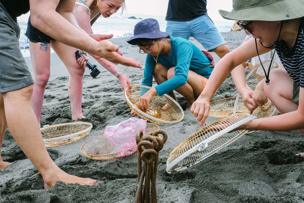 在東海岸,當部落大人下海找尋食物時,孩子們就待在岸邊捕浪花蟹、抓沙蟹加菜酥炸當零嘴。以廢棄的電風扇殼為網,綁上小管當誘餌,趁著浪退之際趕緊埋入沙中做為陷阱,放在浪頭和浪尾之間是最佳位置,切記挖沙時側身而不要屁股朝向大海,避免突然大浪來襲而不知覺。等待時Leo又教我們循著沙灘上的小孔洞抓沙蟹,這些都是與海共生、世代相傳下的生活智慧。
