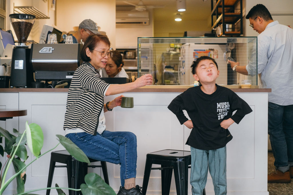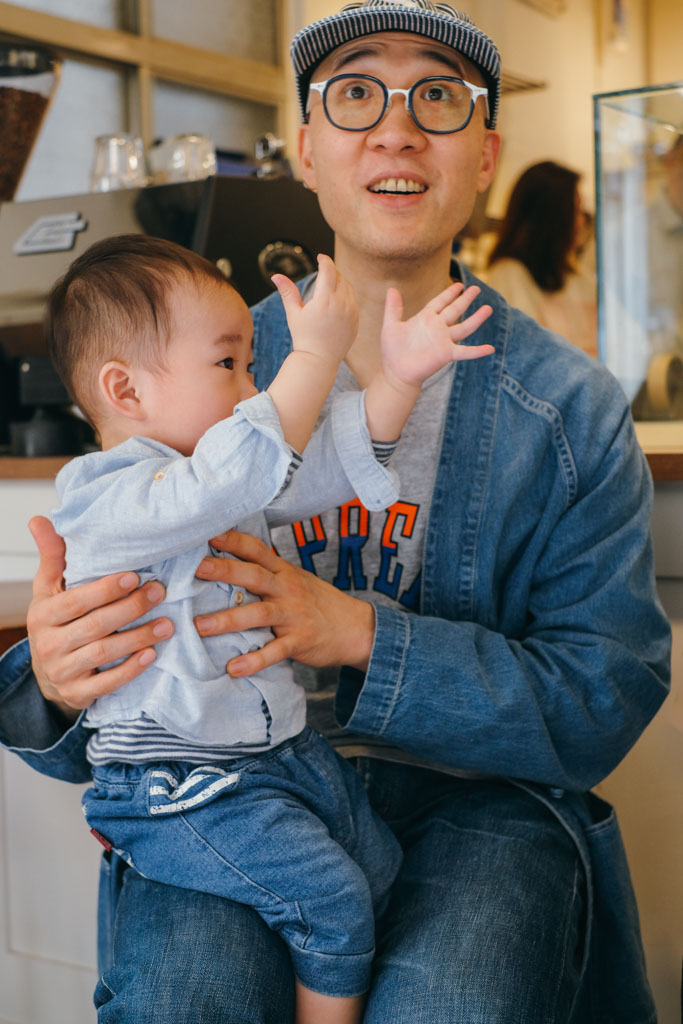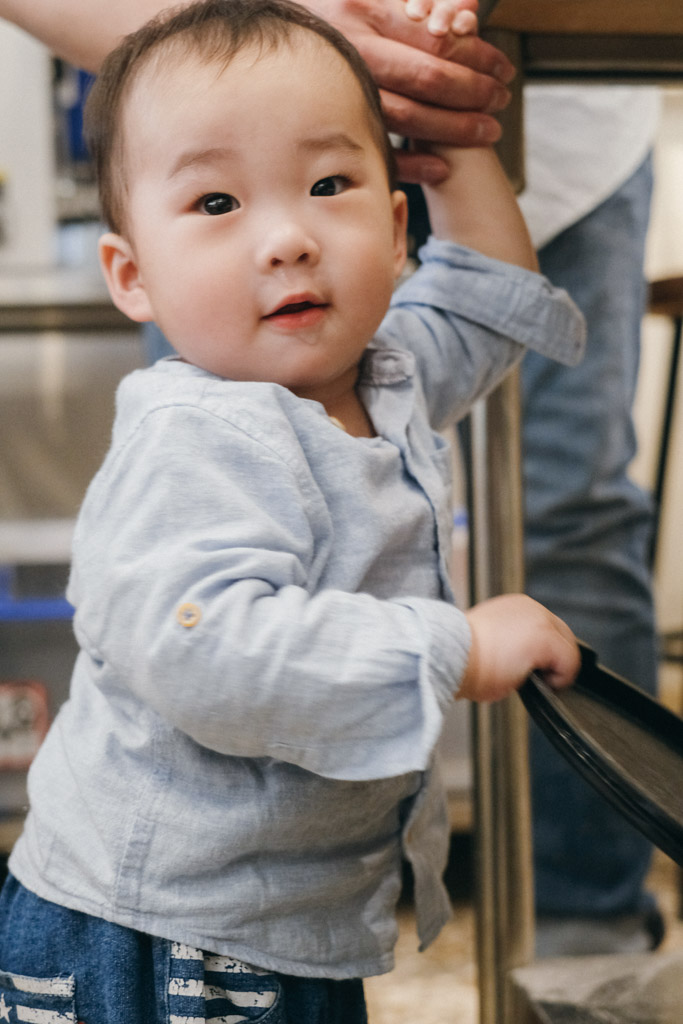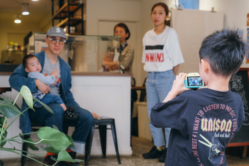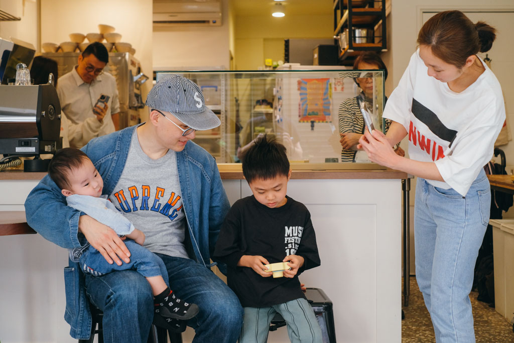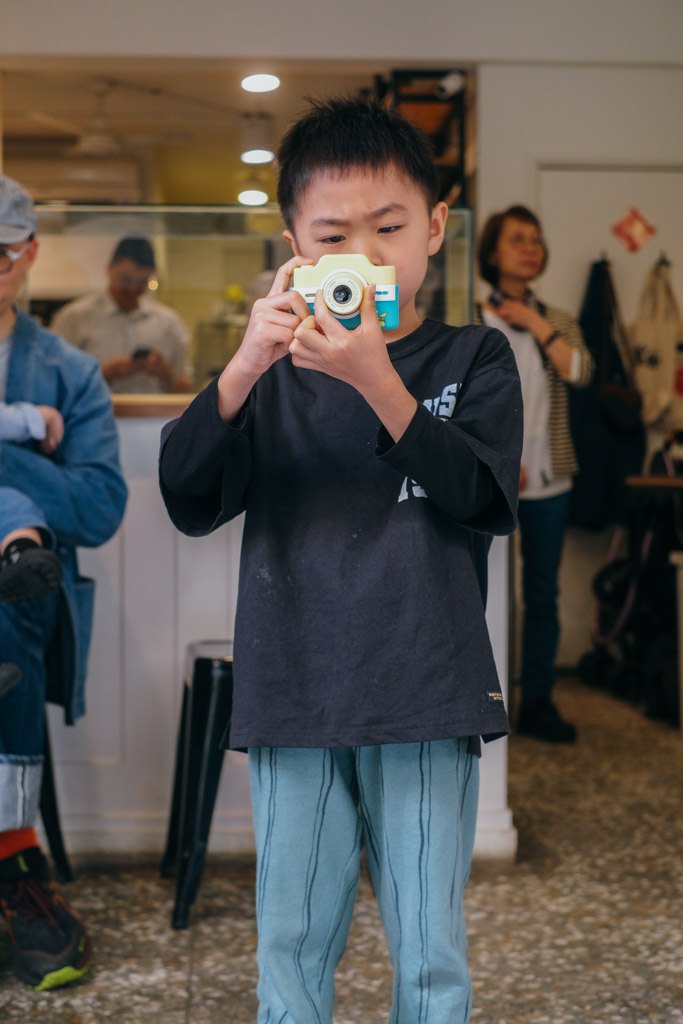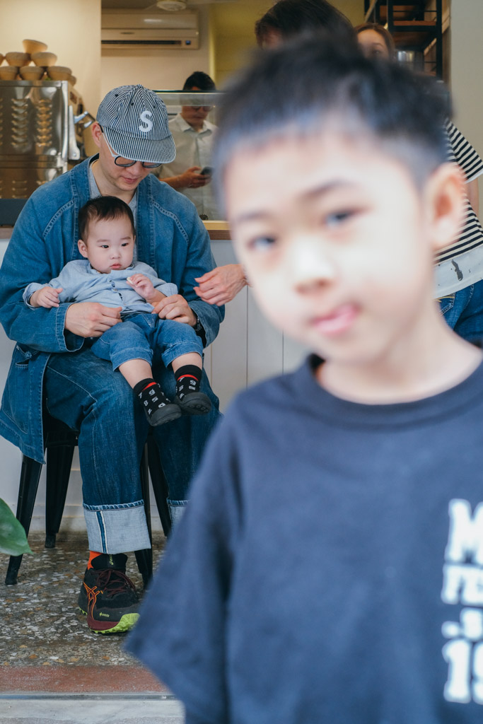 過程中,大鵝子先是跟我現他的皮卡丘相機,然後用爸爸的徠卡和我互拍。後來因為店裡肉桂捲全都是要出貨的沒得吃而鬧脾氣,表情嚴肅的Jerry(疑似)耐著性子對他曉以大義,而身為局外人,最喜歡拍下這種好有生活感的僵局。