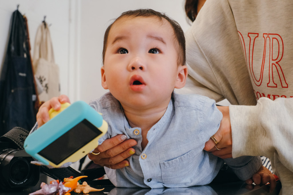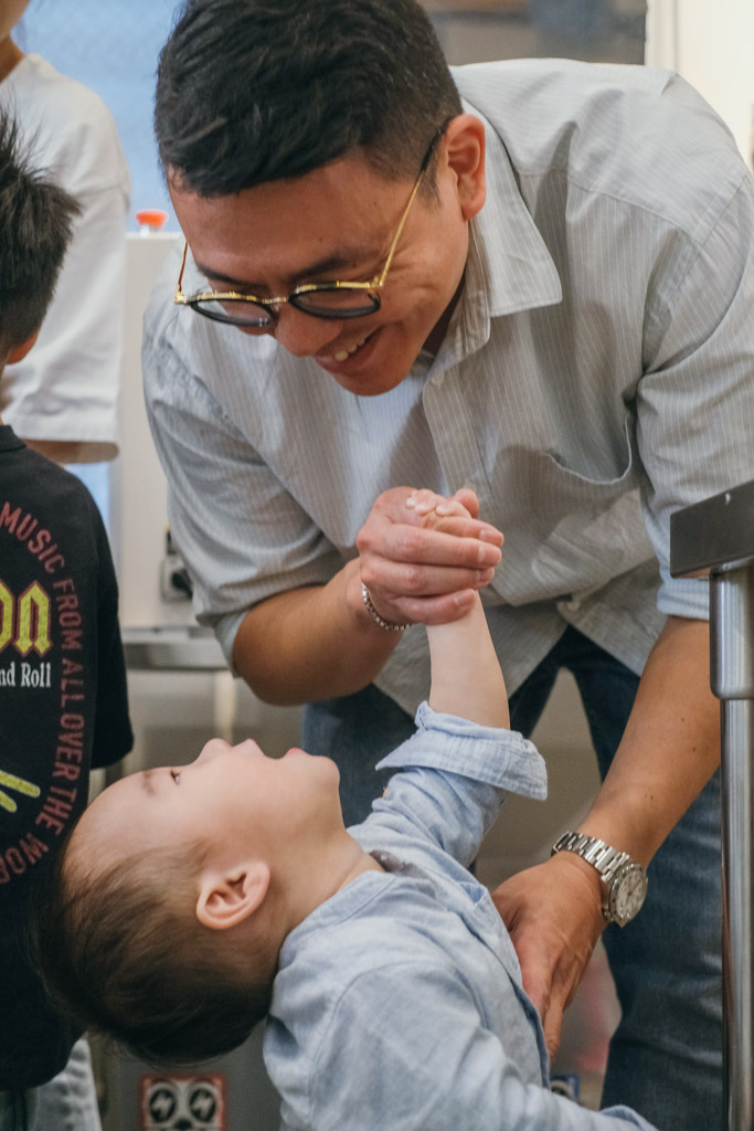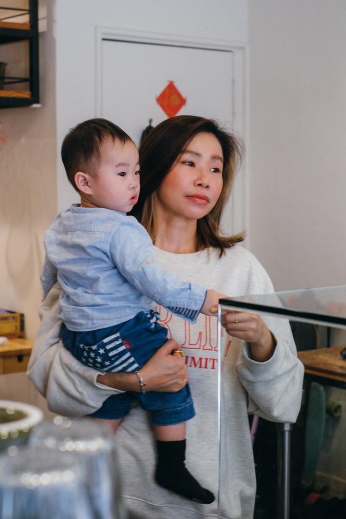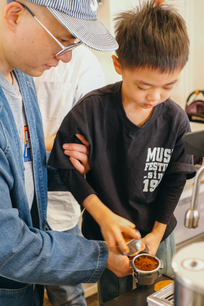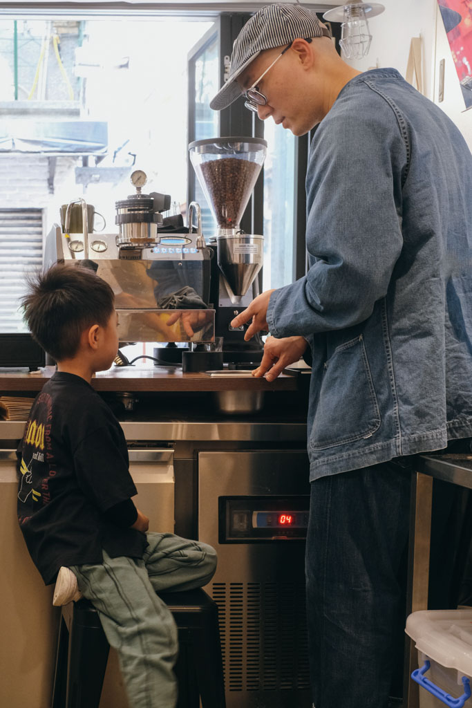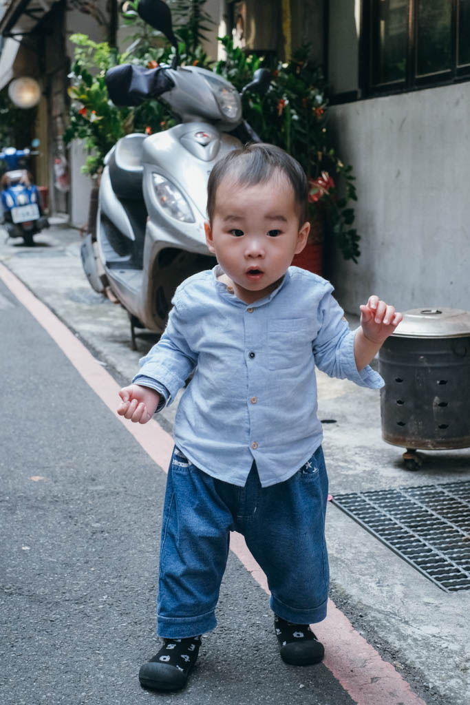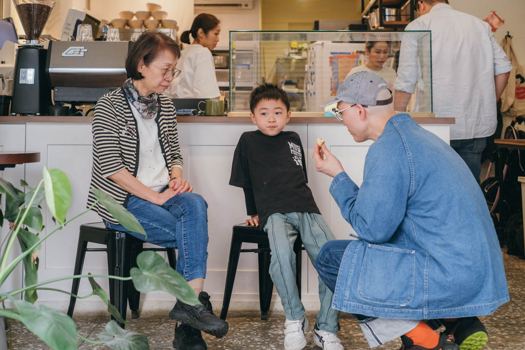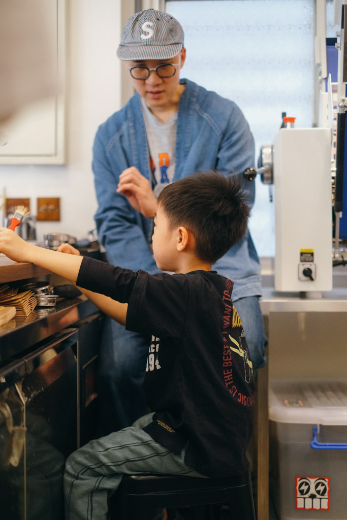 過程中,大鵝子先是跟我現他的皮卡丘相機,然後用爸爸的徠卡和我互拍。後來因為店裡肉桂捲全都是要出貨的沒得吃而鬧脾氣,表情嚴肅的Jerry(疑似)耐著性子對他曉以大義,而身為局外人,最喜歡拍下這種好有生活感的僵局。