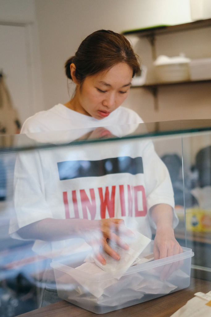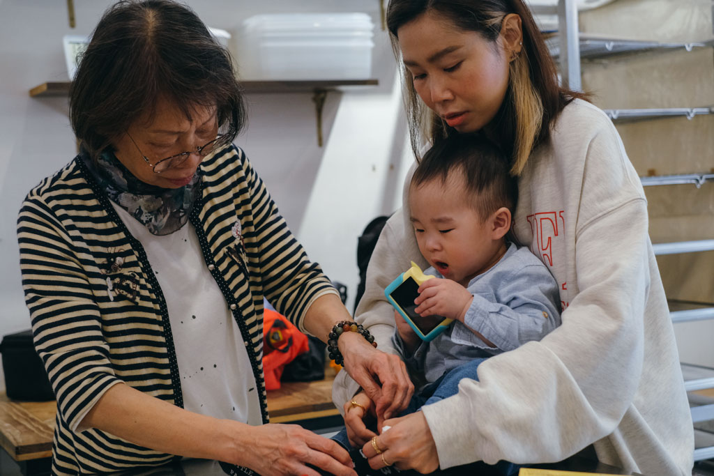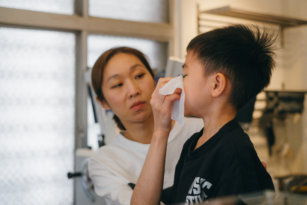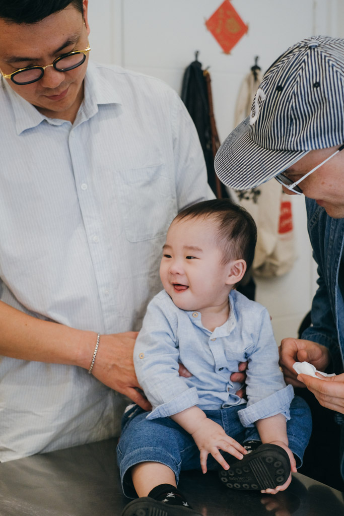 原先想像或許能像攝影集/電影《浅田家》那樣做趣味的角色扮演,最後還是決定以最自然和日常的模樣呈現。選了週六店休日就在工作室拍攝,成員是除了Jerry和阿璞一家四口,還有阿璞的媽媽、姐姐和姐夫,沒有特別蕊拍攝腳本,我就默默地四處游移按快門,意外捕捉到據說鮮少化妝的阿璞、正對著不鏽鋼機台的鏡射補唇蜜。